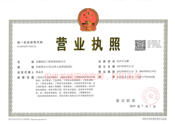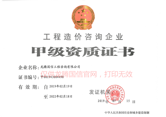 龍騰國信工程咨詢有限公司注冊資本金5000萬元,具有建設部頒發(fā)的工程造價咨詢企業(yè)甲級資質和招標代理資質。我司具有中國建設工程造價管理協(xié)會AAA級信用企業(yè)、湖南省建設工程造價管理協(xié)會AAA級信用企業(yè)、湖南省建設工程造價管理協(xié)會優(yōu)秀會員單位、湖南省招標投標協(xié)會優(yōu)秀會員單位,同時連續(xù)多年被評委“湖南省守合同重信用”企業(yè)。