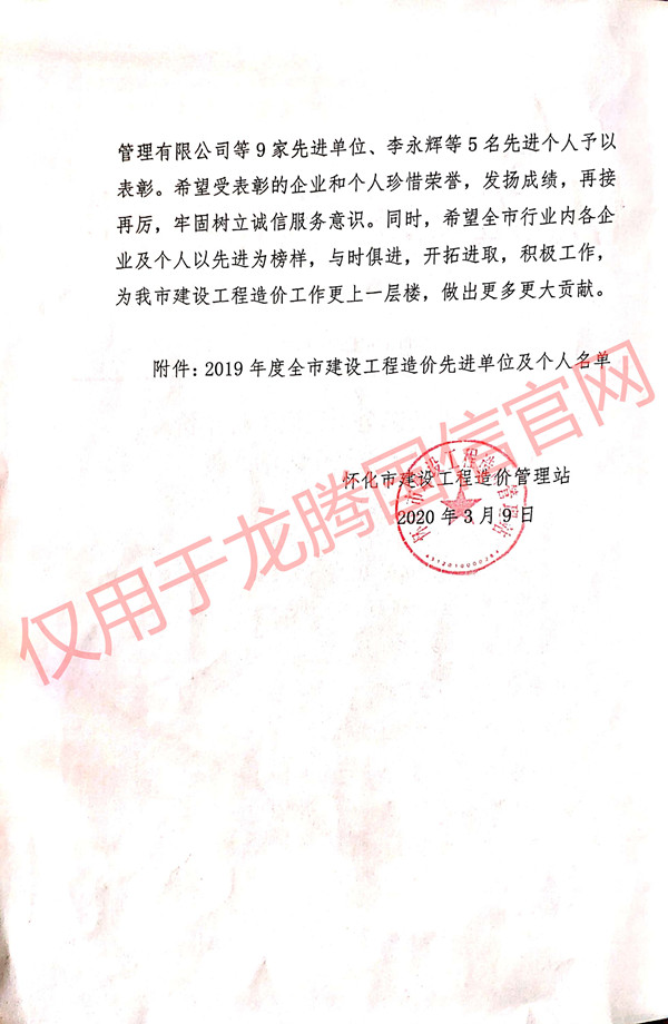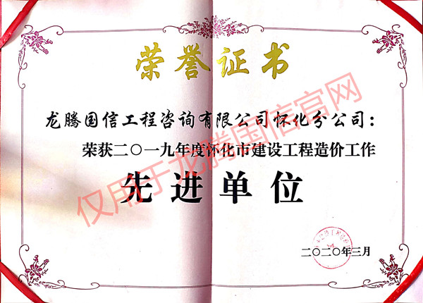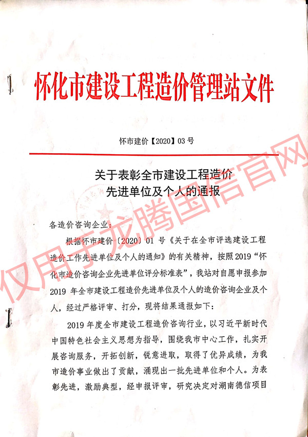 根據‘懷市建價【2020】03號’文件,恭賀本公司榮獲‘2019年度懷化市建設工程造價工作先進單位’。