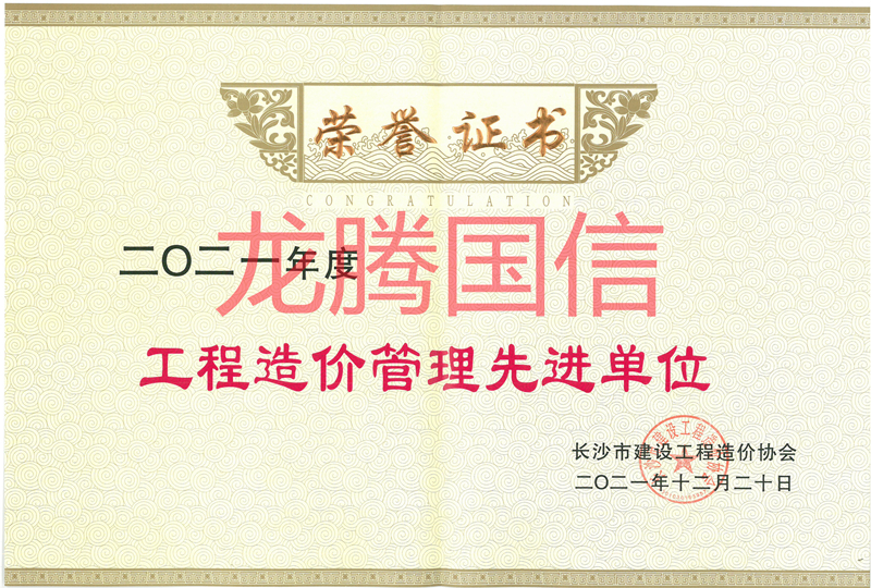 2021年,長沙市建設(shè)工程造價協(xié)會在上級各部門的領(lǐng)導和指導下,經(jīng)全體會員的共同努力,我市工程造價行業(yè)發(fā)展穩(wěn)步推進,行業(yè)力量不斷凝聚,造價咨詢服務(wù)取得了新的成績,涌現(xiàn)出一批成績顯著的單位,為表彰先進,決定授予“龍騰國信工程咨詢有限公司”“工程造價管理先進單位”,并予以通報表彰。