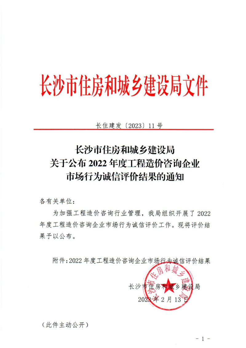 近日,長沙市住房和城鄉(xiāng)建設(shè)局為加強(qiáng)工程造價(jià)咨詢行業(yè)管理,組織開展了2022年度工程造價(jià)咨詢企業(yè)市場行為誠信評價(jià)工作,我單位獲評“2022年度工程造價(jià)咨詢企業(yè)信用等級AAA”。