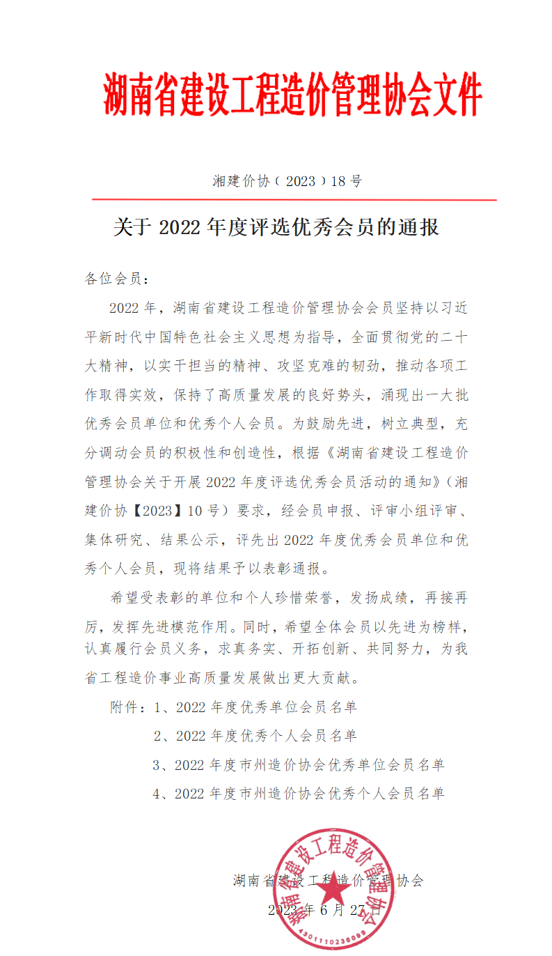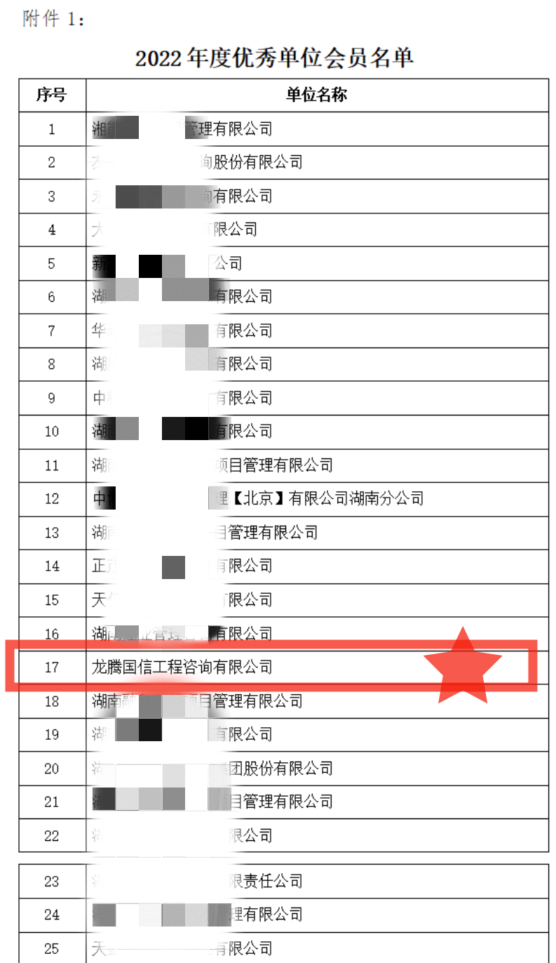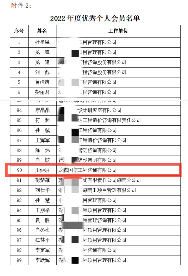 2022年,湖南省建設(shè)工程造價(jià)管理協(xié)會(huì)會(huì)員堅(jiān)持以習(xí)近平新時(shí)代中國(guó)特色社會(huì)主義思想為指導(dǎo),全面貫徹黨的二十大精神,以實(shí)干擔(dān)當(dāng)?shù)木?、攻?jiān)克難的韌勁,推動(dòng)各項(xiàng)工作取得實(shí)效,保持了高質(zhì)量發(fā)展的良好勢(shì)頭,涌現(xiàn)出一大批優(yōu)秀會(huì)員單位和優(yōu)秀個(gè)人會(huì)員。為鼓勵(lì)先進(jìn),樹(shù)立典型,充分調(diào)動(dòng)會(huì)員的積極性和創(chuàng)造性,根據(jù)《湖南省建設(shè)工程造價(jià)管理協(xié)會(huì)關(guān)于開(kāi)展2022年度評(píng)選優(yōu)秀會(huì)員活動(dòng)的通知》(湘建價(jià)協(xié)【2023】10號(hào))要求,經(jīng)會(huì)員申報(bào)、評(píng)審小組評(píng)審、集體研究、結(jié)果公示,“龍騰國(guó)信工程咨詢(xún)有限公司”榮獲湖南省建設(shè)工程造價(jià)管理協(xié)會(huì)2022年度“優(yōu)秀單位”、公司造價(jià)工程師周燕屏獲“優(yōu)秀個(gè)人”榮譽(yù)稱(chēng)號(hào)。
