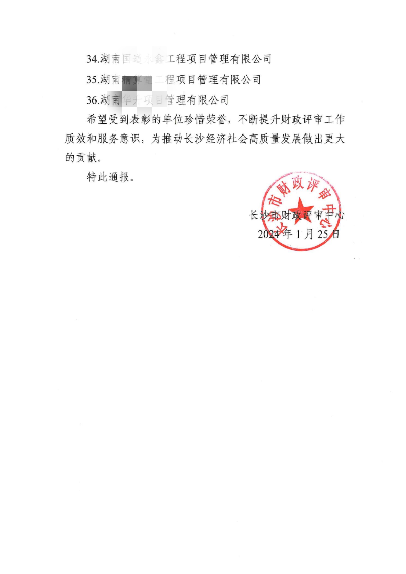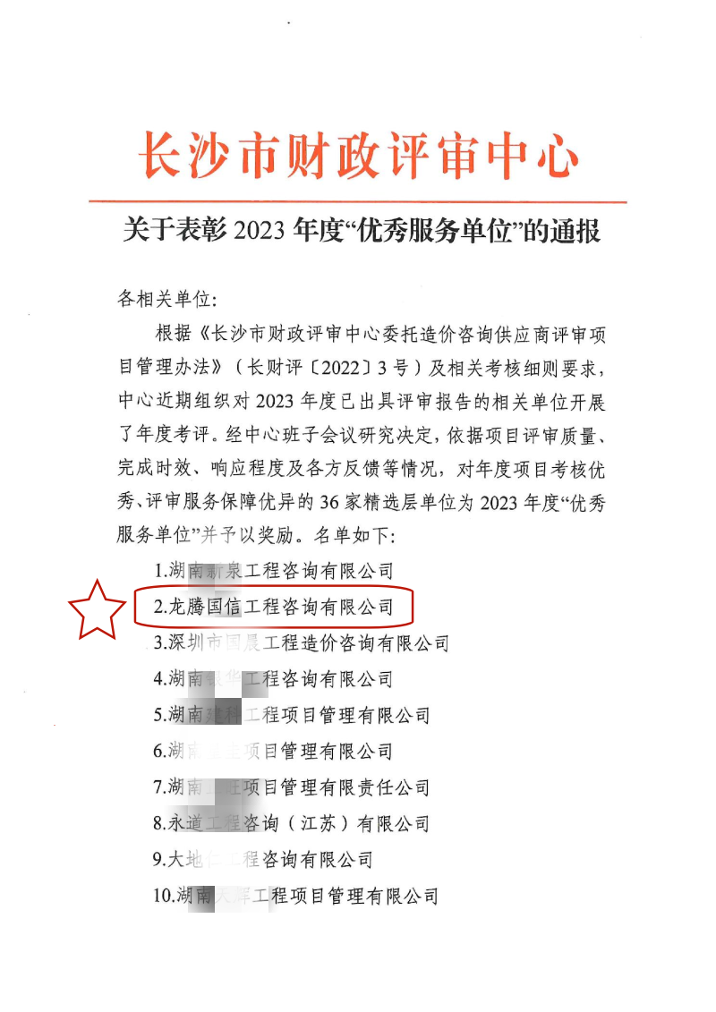 根據(jù)《長沙市財政評審中心委托造價咨詢供應(yīng)商評審項目管理辦法》(長財評〔2022〕3號)及相關(guān)考核細則要求,長沙市財政評審中心近期組織對2023年度已出具評審報告的相關(guān)單位開展了年度考評。經(jīng)長沙市財政評審中心班子會議研究決定,依據(jù)項目評審質(zhì)量、完成時效、響應(yīng)程度及各方反饋等情況,根據(jù)對年度項目考核優(yōu)秀、評審服務(wù)保障優(yōu)異的精選層單位評選,我單位龍騰國信工程咨詢有限公司被評為2023年度“優(yōu)秀服務(wù)單位”。
