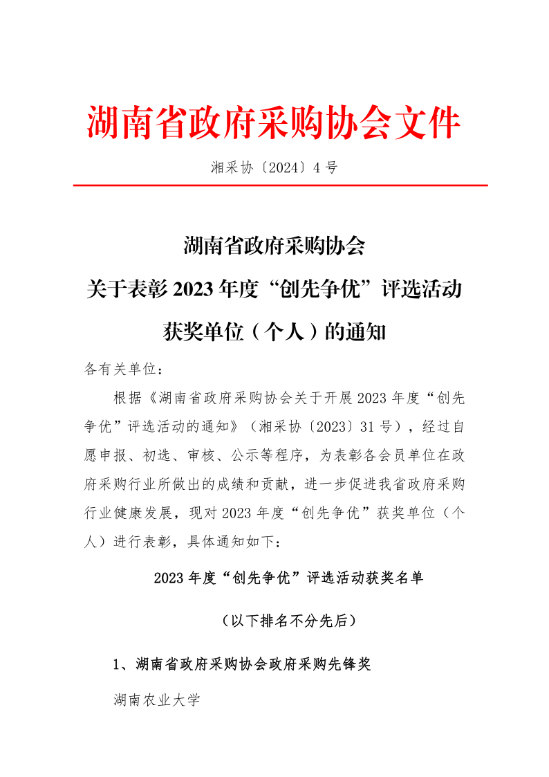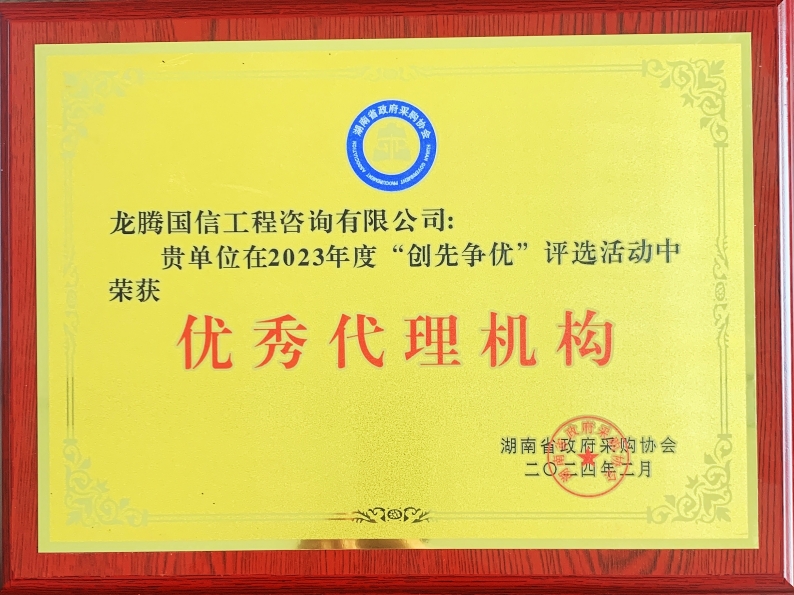 根據(jù)《湖南省政府采購協(xié)會關(guān)于開展2023年度“創(chuàng)先爭優(yōu)”評選活動的通知》(湘采協(xié)〔2023〕31號),為表彰各會員單位在政府采購行業(yè)所做出的成績和貢獻,進一步促進我省政府采購行業(yè)健康發(fā)展,我單位獲評2023年度“優(yōu)秀代理機構(gòu)”。