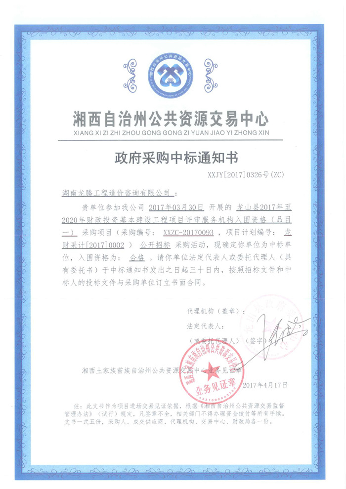 恭賀本公司入圍‘龍山縣2017年至2020年財(cái)政投資基本建設(shè)工程項(xiàng)目評(píng)審服務(wù)機(jī)構(gòu)庫(kù)